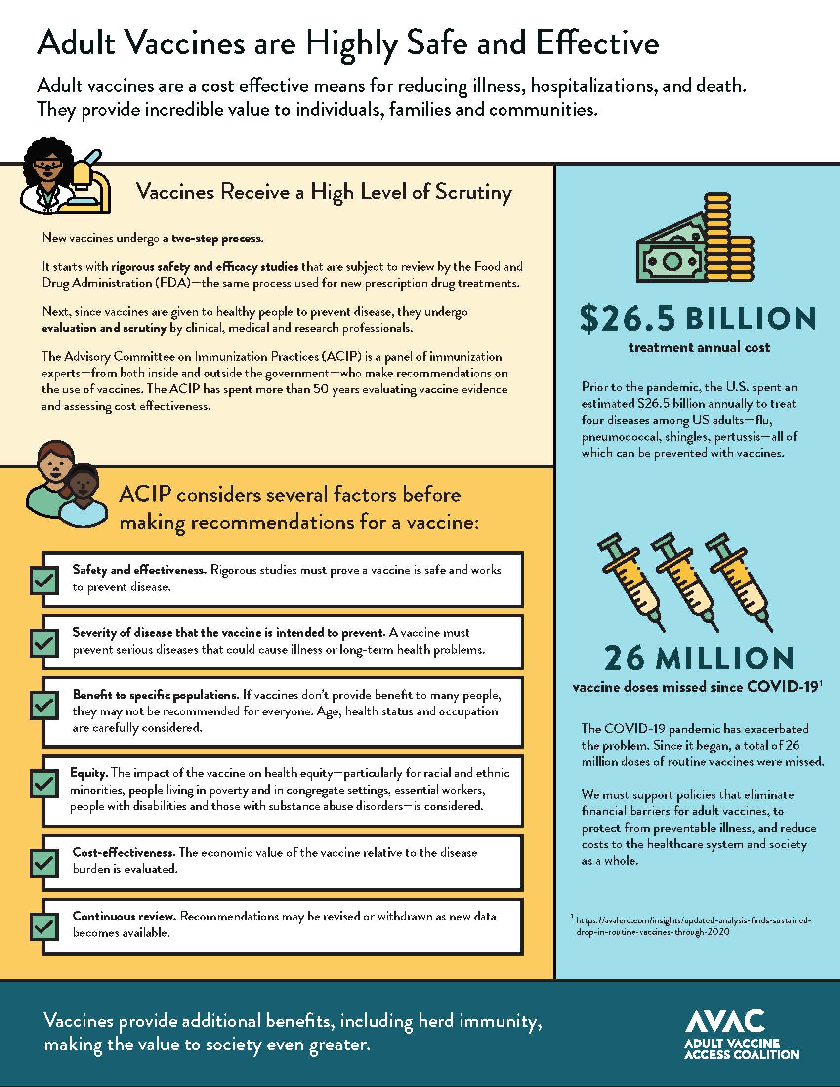 Factsheet provides information about the safety and benefits of adult routine vaccines. The factsheet describes the rigorous process that vaccines go through before they are available to the public and how the Advisory Committee on Immunization Practices (ACIP) decides to recommend a vaccine. The factsheet also describes the costs associated with treating diseases that could be prevented with vaccines.