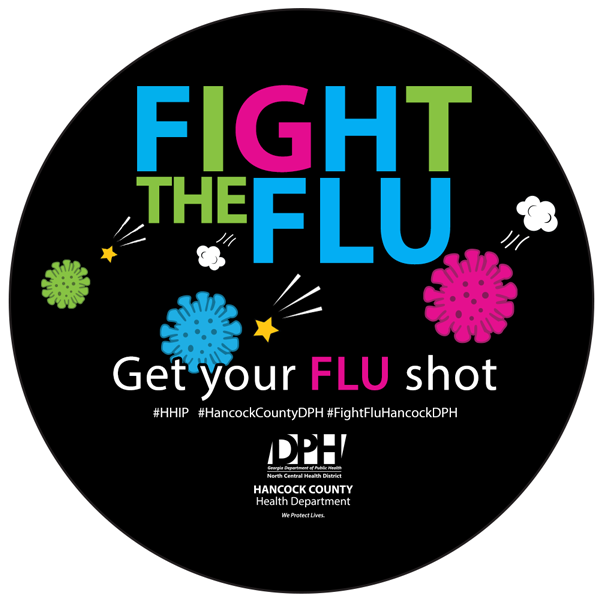 Graphic from the Hancock County Health Department encourages individuals to get vaccinated against the flu. The Hancock County Health Department uses the #FightFlu slogan to motivate communities to vaccinate against the flu this season. The resource is available for download and can be used to help organizations create their own graphics to promote getting a flu shot.