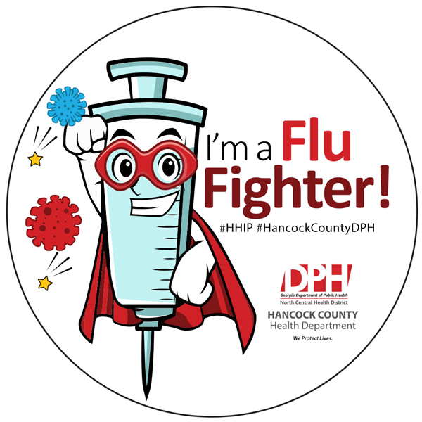 Graphic for social media developed by the Hancock County Health Department encourages the community to get vaccinated against the flu. The button communicates the slogan "I'm a Flu Fighter".
